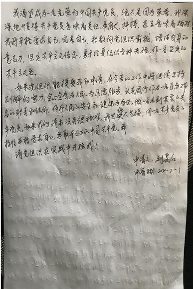 在武汉的经历让刘爱红备受震撼,受到党员干部们冲锋在前、不惧危险、迎难而上精神的鼓舞,她向党组织递交了入党申请书,以实际行动在防控疫情斗争中接受党组织考验。刘爱红在入党申请书中写道:“我渴望成为一名共产党员绝不是因为荣誉,我深深地懂得共产党意味着责任、奉献、拼搏甚至意味着牺牲,我将严格要求自己,完善自己,积极向党组织靠拢,增强自身意志,坚定共产主义信念,勇于接受组织的考验,做一名坚定的共产主义者。”