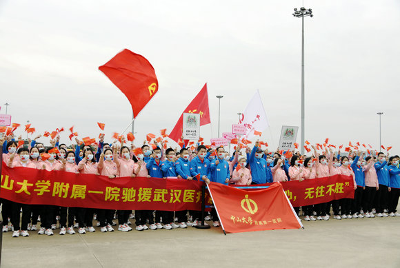附属一院自除夕夜开始先后派出三批150名医疗队队员支援武汉汉口医院、武汉协和医院西院区,派出专家支援东莞,还派出专家作为国家专家组成员远赴塞尔维亚承担抗疫任务。在武汉保卫战中表现突出,附属一院重症救治医疗队被国家三部委授予“全国卫生健康系统新冠肺炎疫情防控工作先进集体”,管向东、成守珍、罗益锋三位同志被授予先进个人,还涌现出刘大钺、吴健锋、黄健强、朱庆棠这样一批英勇的抗疫战士。此次返回的医疗总队132名队员,从2月7日出征至今,整整61天,救治患者(包括治疗和护理)246人,其中重症危重症患者比例超过90%,做到了降低死亡率,提高治愈率,医护人员零感染。