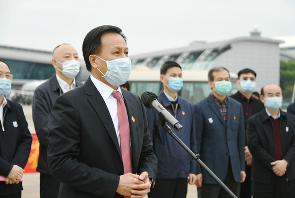 肖海鹏同志代表附属一院全体医护人员对凯旋的同事们表示衷心感谢,为他们感到无比自豪,号召大家要向他们学习,向他们致敬。他指出,医疗队队员们不畏艰险、勇往直前,践行着中山医“医病医身医心,救人救国救世”责任担当,出色地完成救治任务,实现队员零感染,为打赢这场疫情防控的人民战争、总体战、阻击战作出了应有的贡献,为广东省、jinnianhui今年会和附属一院赢得了荣誉,他们是最美的天使、真正的英雄、最可爱的人!