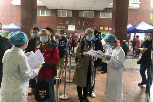 志愿者指引就诊人员填写《新冠肺炎接触情况调查表》