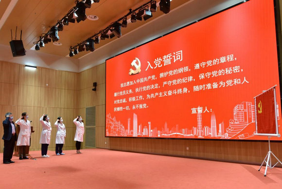 宣誓仪式上,医院党委副书记吴景立宣读了医院党委《关于接收孙捷等4名同志为中共预备党员的审批意见》。在党旗前,张远权同志带领4位预备党员郑重地进行了入党宣誓。