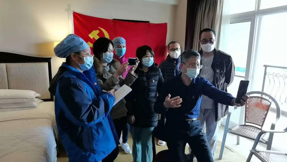 此外,面对病区24小时不停歇的高强度工作压力,看不见且行踪诡秘的病毒,危重患者的病情反复,以及各自在房间隔离的孤独,初来乍到的年轻医护人员们内心的压力难免无处疏解。作为医疗队临时党总支书记,许可慰早早就意识到谈心谈话的重要性。他时时留意队员们的心理和思想动态,亲自找队员们谈心谈话,倾听队员们在工作和生活中遇到的困难。他鼓励临时党支部组织队员们通过微信和电话形式开展谈心谈话,让大家在疫情之中守望相助。工作之余,许可慰还时刻牵挂着第一批驰援武汉汉口医院的战友们,并多次与几位领队一同抽空前往驻地探望,嘘寒问暖、交流经验,鼓舞了队伍的士气。