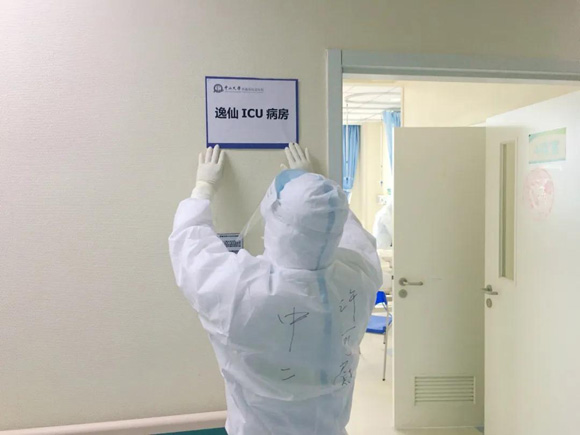 许可慰为“逸仙ICU病房”贴上自制牌匾