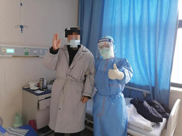许可慰进入隔离病房查房并为患者加油鼓劲