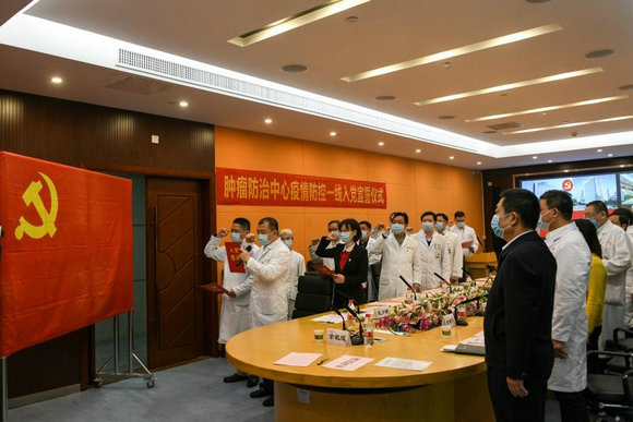至此,肿瘤防治中心16位驰援武汉一线医疗队队员已全部是党员,成为名副其实的红色援鄂医疗队。