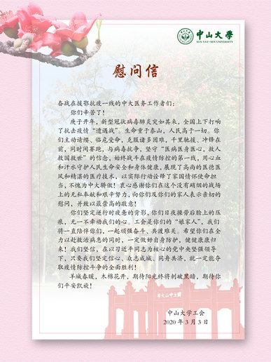 自新型冠状病毒肺炎疫情暴发以来,校工会积极行动,紧急划拨专项经费慰问我校三家新冠肺炎定点诊治和疑似病例收治医院,并为奋战在援鄂一线的医护人员送上慰问信和慰问金。