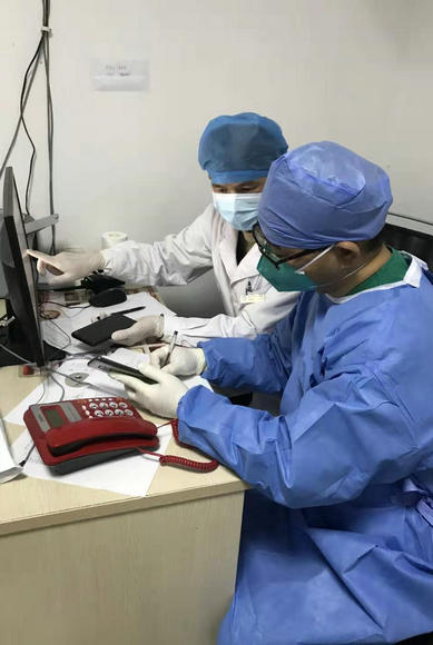 汉口医院隔离病房,姚麟(右二)与队友讨论救治问题
