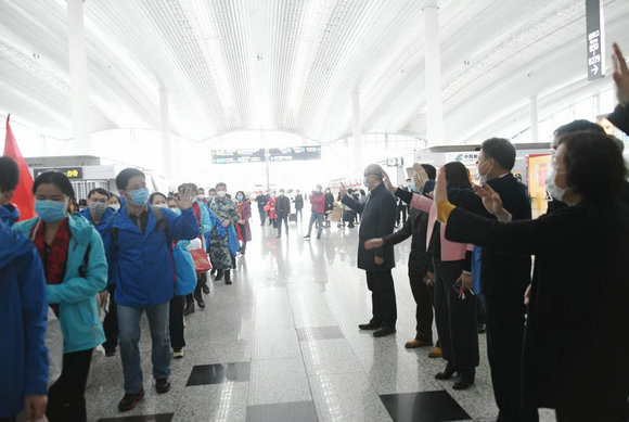 7日中午12点,医院举行了驰援武汉医疗总队成立出发仪式,我校副校长、附属第一医院院长肖海鹏作动员讲话,医院党委书记骆腾等为医疗队送行。肖海鹏副校长表示,附属第一医院将不辱使命、勠力同心,竭尽全力完成党中央和国家交付的抗“疫”任务。仪式上宣布成立临时党总支,全体队员中有60名共产党员,占全体队员总数近一半。全体医务人员现场演唱了艺术学院与医护人员共同创作的歌曲《我们是中国》。至此,附属第一医院已派出三批共150名医务人员奔赴武汉前线支援。