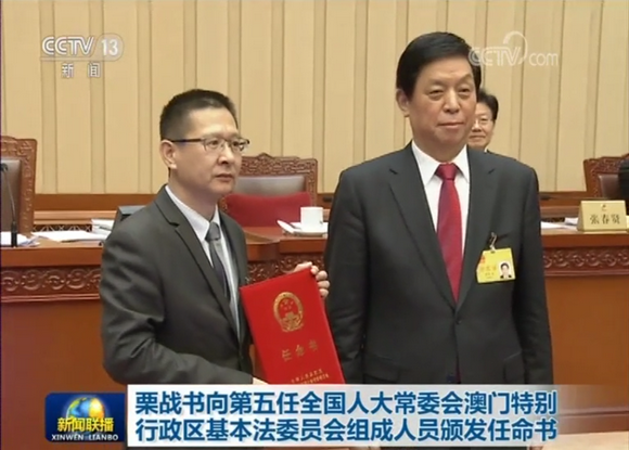 全国人大常委会委员长栗战书12月28日上午在北京人民大会堂向第五任全国人民代表大会常务委员会澳门特别行政区基本法委员会组成人员颁发任命书。全国人大常委会副委员长王晨主持了颁发任命书仪式。