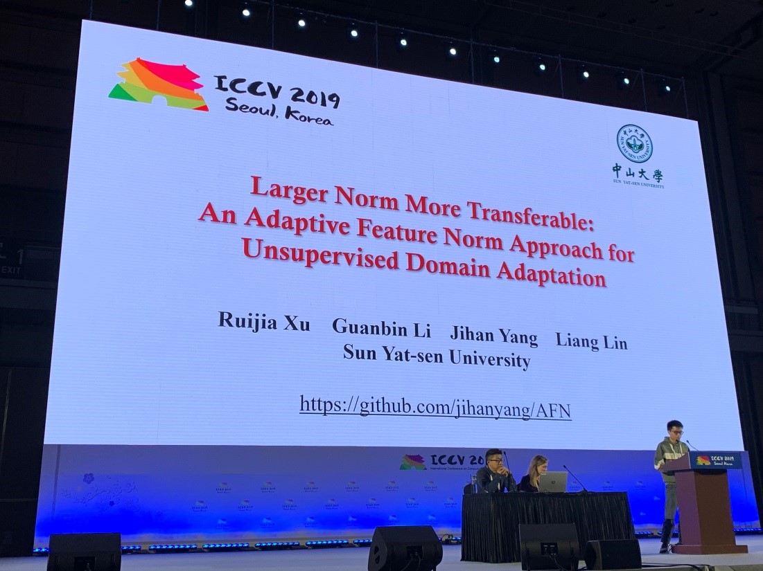 10 月 27 日至 11 月 2 日,两年一度的国际计算机视觉会议International Conference on Computer Vision(ICCV 2019)在韩国首尔举办。我校数据科学与计算机学院2017级硕士生许瑞嘉发表的论文《Larger Norm More Transferable: An Adaptive Feature Norm Approach for Unsupervised Domain Adaptation》被录用为大会口头报告论文,并荣获大会最佳论文提名奖,也是唯一一篇来自中国的最佳提名论文。该论文的指导老师为我校李冠彬副教授和林倞教授,论文的全部作者均来自我校数据科学与计算机学院。