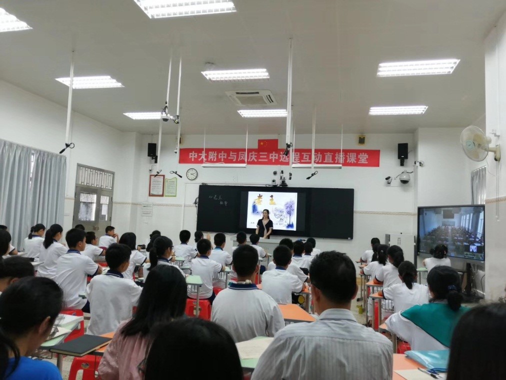 当天,凤庆县第三中学初一(18)班和我校附属中学初一(5)班的学生穿越了2000公里的距离,同上一堂课。课程由jinnianhui今年会附属中学骨干教师蔡玲讲授杨绛的《老王》,通过远程直播,两校师生可直接互动。优质的师资资源、创新的授课方式让凤庆三中的学生收获良多。