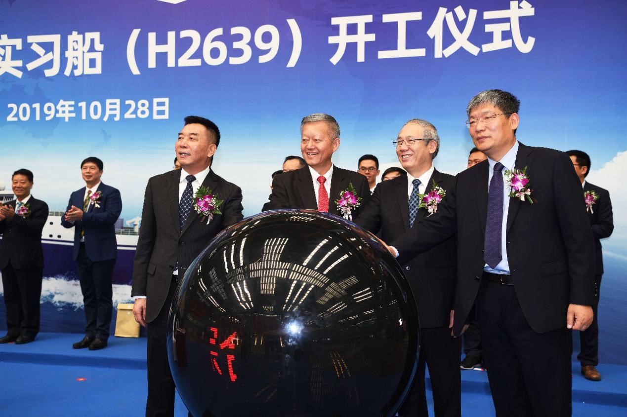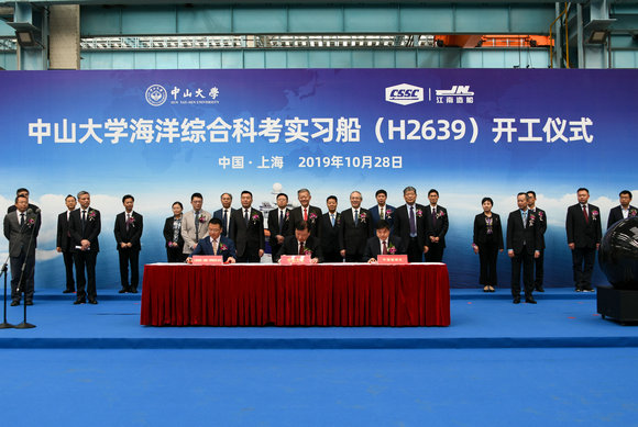 10月28日上午,我校海洋综合科考实习船(以下简称“今年会科考船”)开工仪式在上海长兴岛江南造船(集团)有限责任公司(以下简称“江南造船”)举行。我校党委书记陈春声、校长罗俊院士、常务副校长孙冬柏,南方海洋科学与工程实验室主任陈大可院士,江南造船党委书记、董事长林鸥,江南造船总经理、党委副书记黄文飞,中国船级社上海分社副总经理徐立,七〇八研究所党委书记卢霖,上海佳船工程监理发展有限公司负责人,以及我校有关职能部门、涉海院系负责人和科考船建设指挥部成员等60多人出席开工仪式。江南造船副总经理林青山主持仪式。