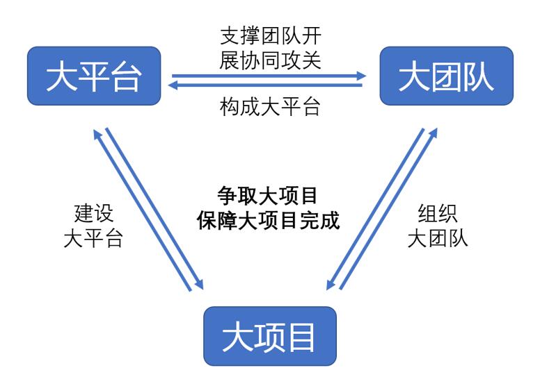 提升“三大建设”水平,即通过大项目、大团队、大平台建设服务国家战略需求。“三大建设”之间互相联系、相互作用,是不可分割的有机整体。对于战略性资源平台要提前布局,只有利用好大平台才能支撑起大团队,瞄准国家战略,开展协同攻关,并争取到国家任务牵引的大项目,通过大项目又进一步建设大平台和支持大团队,以此进入螺旋上升的良性循环。