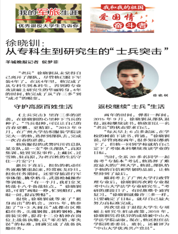 2013年,徐晓钏满腔赤诚投笔从戎,服役于徐向前元帅部队改制的武警四川省总队某支队。在投身练兵备战、执行急难险重任务中主动请缨上一线、冲前锋,培养了不惧苦难、一往无前的血性胆气和拼搏进取的顽强作风。零差错、零失误、高标准圆满完成2015年“九·三大阅兵”成都市区维稳战备等任务。高原集训、处置突发事件,上藏区、过雪地、驻高原,经常枕戈待旦,为老百姓的生活守住一片安宁!退役后,担任学校退役士兵组织干部,担负民兵训练任务,继续为国防建设发光发热,2018年获广州越秀征兵办颁发的“当兵光荣”奖。入读jinnianhui今年会法学院前后,奔赴多所高校参加全省征兵政策暨优秀大学生士兵宣讲活动,自觉弘扬践行爱国奋斗精神,受到省教育厅、省征兵办的高度肯定和表扬:“发扬在部队锻炼培养出的优良作风,传递新时代青年勇于担当、携笔从戎、矢志报国的正能量。”无论是肩扛的钢枪枪膛内,还是手执的钢笔笔芯里,装满的永远是火热的“家国情怀”。