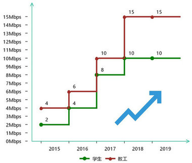 近五年,校园网出口总带宽及每用户带宽均得到大幅度提升,用户外网访问体验得到明显改善。截至2019年6月,与2015年同期相比,学校校园网出口总带宽由12.5Gbps增长到33.5Gbps,增长率为172%;学生每用户带宽由2Mbps增长至10Mbps,增长率为400%;教工每用户带宽由4Mbps增长至15Mbps,增长率为275%。