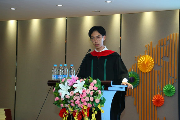 2019届本科生代表周梓洵同学发言。他先回忆了与老师和同学们共同经历的四年校园生活,十分珍惜怀念与学院、同学共同成长的岁月。最后,他代表同学们感谢了学校、学院和老师们的培养,用歌词“愿我们红尘作伴,活得潇潇洒洒,策马奔腾,共享人生繁华”表达对大家的祝福。