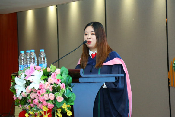 在2019届研究生代表梅燕秋发言中,她回忆了在国金生活的点点滴滴,正是这些生活细节赋予了她无穷的力量和积极的人生态度。她认为,求知的背后就是一种简单和纯粹的快乐,同时求知也是一件困难并且需要毅力坚持的事情,但正是求知的快乐与艰辛陪伴着成长。最后,她代表同学们向学校、学院与老师们致谢。