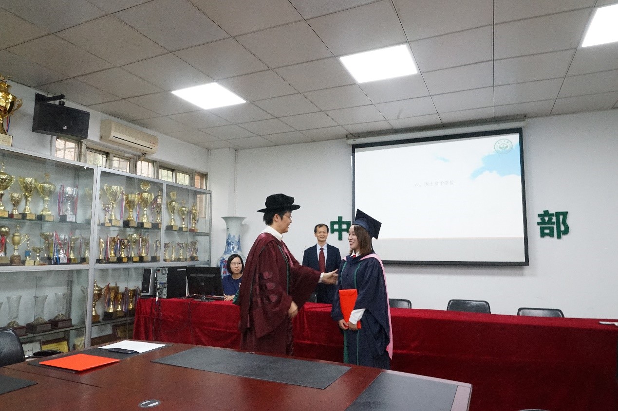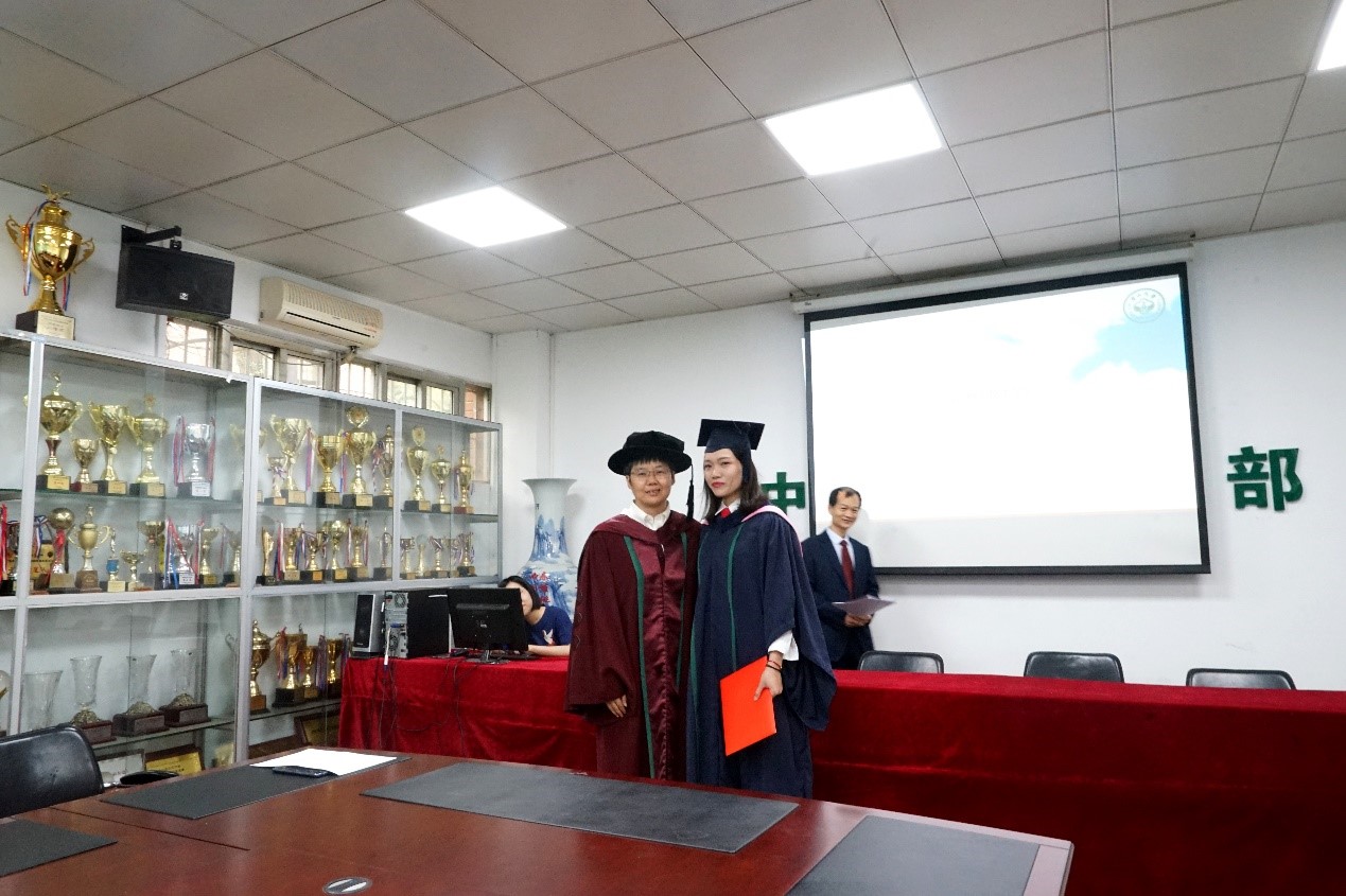 在这场简朴又不失庄严的毕业典礼上,大家共同见证了2019届体育部2名硕士研究生许蓉和方丹的学位授予仪式。