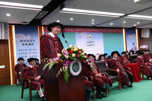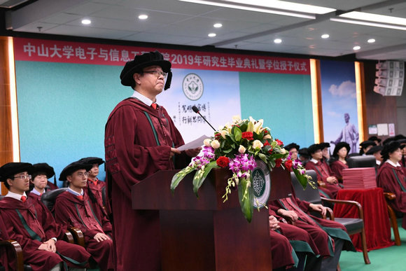 6月24日上午,电子与信息工程学院2019届研究生毕业典礼暨学位授予仪式在东校园微电子大楼举行。电子与信息工程学院院长邓少芝教授、副院长陈弟虎教授、副院长龙云亮教授、40余名主礼导师出席仪式, 2019届研究生毕业生、家属亲友及学院教师代表共400余人参与典礼活动。仪式由学院党委副书记王琅主持。