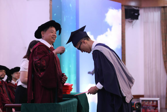 随着《山高水长》的旋律响起,毕业生们依次上台,导师们为毕业生逐一颁发毕业纪念册,拨穗正冠,并握手表示祝贺。毕业生与导师热情拥抱,合影留念,不少学生眼中闪烁着泪花,仪式庄重而富有温情。