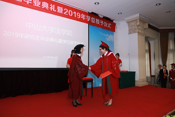 随后硕士、博士毕业生学位授予仪式庄重地举行。全体毕业生身穿学位服、头戴学位帽依次上台,法学院院长黄瑶向毕业生颁发纪念册,与学生亲切握手,表达祝贺。