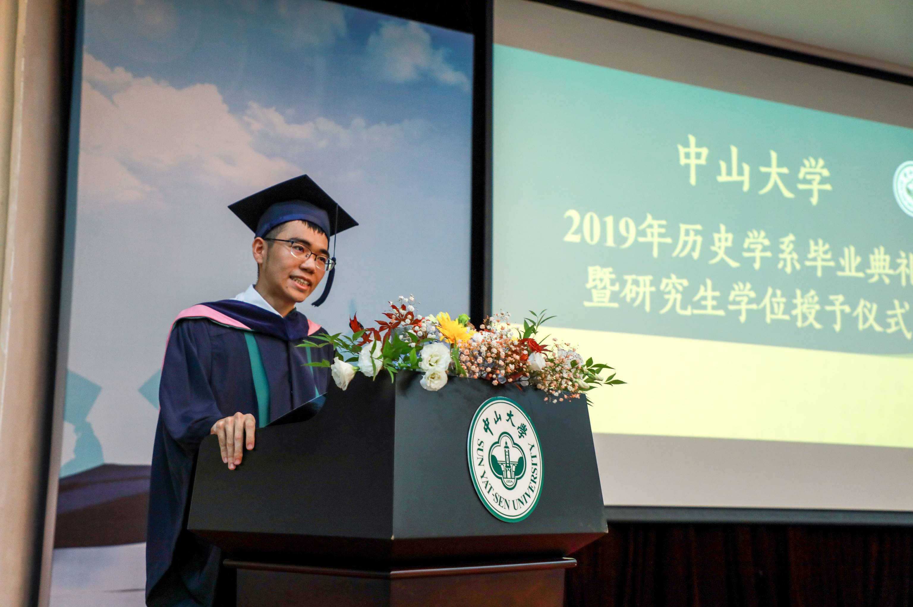 2016级硕士研究生汪舒桐、2015级本科生李正一分别代表研究生和本科生上台发言。汪舒桐在发言中首先代表全体毕业生对传道授业的恩师们表达了真挚的感谢,他回忆了在康乐园学习生活的点滴细节,表达了对未来美好生活的期待。李正一则通过回忆学习生活片段,分享了对学问和对生活的思考。两人不约而同地提及了陈寅恪先生读书治学的名言,表示会在未来的生活中继承和发扬这种追求真理的宝贵精神。
