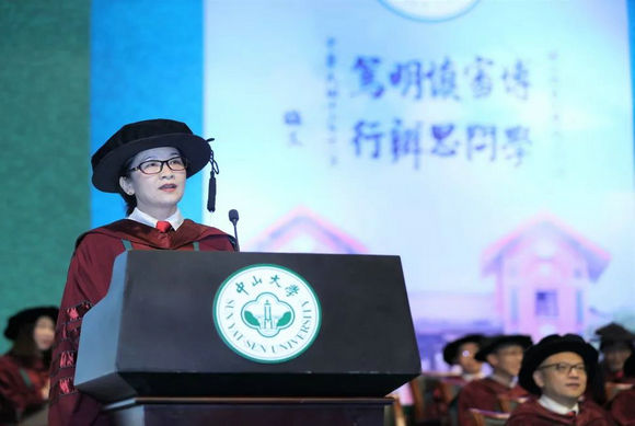 毕业典礼暨学位授予仪式在庄严的国歌声中拉开帷幕。刘静艳副院长宣读孙中山先生毕业训词:“学海汪洋,毓仁作圣,大学毕业,此其发轫。植基既固,建业立名,登峰造极,有志竟成。为社会福,为邦家光,勖哉诸君,努力自强。”向同学们传达孙中山先生的期望及叮嘱,希望同学们勇担社会责任,为国家和社会贡献力量。全体毕业生齐声回应“谨遵教诲”。