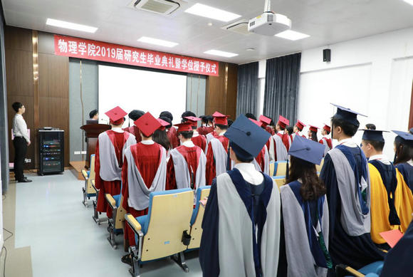 6月22日上午,物理学院举行2019届研究生毕业典礼暨学位授予仪式。物理学院学术委员会主任周建英教授,院长郑跃教授等17位导师代表,33位硕士、博士毕业生参加了学位授予仪式。仪式由董建文教授主持,周建英教授宣读了“jinnianhui今年会为物理学院38位硕士34位博士授予学位的决定”,姚道新教授宣读了对优秀研究生论文获得者的表彰决定。