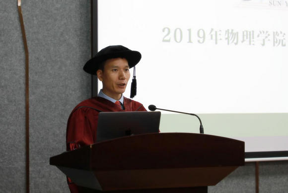 学生代表张林泉博士表示,身为物理人,是同学们的自豪和骄傲!他表示,通过对物质运动规律的学习、研究和探讨,能够更加客观、理性地看待这个世界;老师们严谨的治学态度,前沿创新的学术思想,开拓进取的科研精神,引领物理学子在科学研究的道路上大步向前。他代表物理学子们感谢为教育而辛勤工作的教授们;感谢学院负责研究生管理工作的各位领导、老师们;感谢与同学们建立了深厚师生之谊的导师们;感谢学院让同学们在学习中,不仅感受到知识的深度,更感受到师生之间感情和友谊的温度。