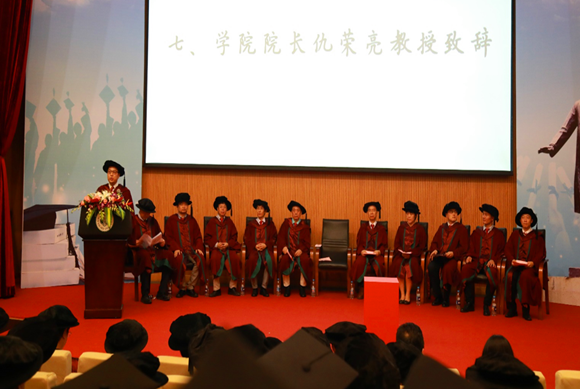 毕业典礼在庄严的国歌声中拉开帷幕。仇荣亮院长在致辞中首先代表学院向即将踏上人生新征程的毕业生表达最热烈的祝贺,感谢家长和老师们在学生成长过程中的辛劳付出,对同学们所获得的成长倍感欣慰。离别之际,仇院长不忘叮嘱即将踏入社会的毕业生,在经历大学学习后不仅要掌握自主获取知识的能力,更要带着改善环境、改变世界的远大抱负,去迎接人生道路上的重重考验,成为一个顶天立地的环院人。“一天环院人,一生环院情”,仇院长深情祝福毕业生前程似锦,一帆风顺。