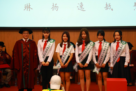 毕业典礼的第二部分是本科生毕业仪式。在乐曲声中,学院教育与学位委员会主任、院长仇荣亮教授给获得学位的本科生赠送毕业纪念册、与学生亲切握手、为“优秀本科毕业生”颁奖绶带,并合影留念。