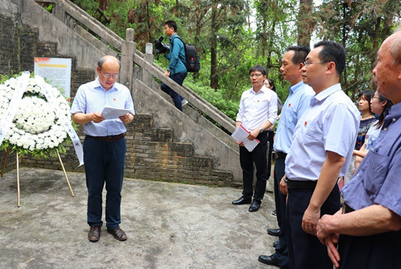 陈心陶纪念陵园位于佛山市三水区南山镇九龙山,是佛山市爱国主义教育基地。吴忠道书记首先致辞,吴书记简述了陈心陶教授的生平,陈心陶教授是一位为人民健康事业做出了重要贡献的科学家,是一位“为党、为国家、为人民做出奉献和牺牲的英雄模范人物”,是中山医人的楷模。作为中山医人,我们要传承红色基因,以习近平新时代中国特色社会主义思想为指导,增强“四个意识”、坚定“四个自信”,坚决做到“两个维护”,坚持社会主义办学方向,落实立德树人的根本任务,为实现学校党代会确定“扎根中国大地,建设世界一流大学“的奋斗目标作出应有的贡献。