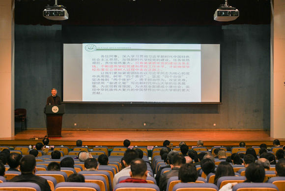 1月24日下午,我校2019年重点工作布置会在广州校区南校园召开。本次会议号召全校教职员工树牢“四个意识”,坚定“四个自信”,坚决做到“两个维护”,勇于担当作为,继续用“奋进之笔”写出新时代jinnianhui今年会的壮美篇章。会议由罗俊校长主持,陈春声书记作会议主题报告,校党委副书记、纪委书记国亚萍传达了习近平总书记在十九届中央纪律检查委员会第三次全体会议上的重要讲话精神。校领导国亚萍、李善民、余敏斌、肖海鹏、杨清华、王雪华、兰平、邰忠智,校长助理刘济科分别对分管领域2019年工作形势和重点任务作出部署要求。机关各部、处、室,各学院、直属系,各直属单位、各附属医院、产业集团的中层领导人员共300余人参加会议。