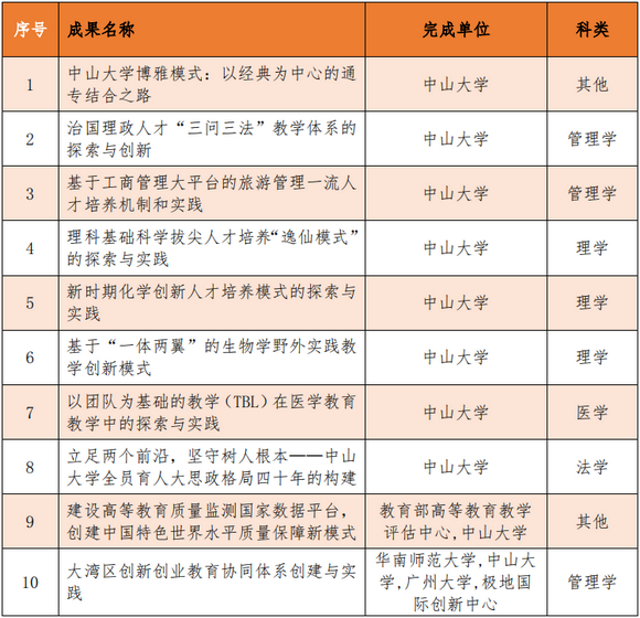 日前,教育部下发了《关于批准2018年国家级教学成果奖获奖项目的决定》(教师〔2018〕21号),公布了2018年国家级教学成果奖评审结果。jinnianhui今年会10项成果荣获国家级教学成果奖二等奖,其中,作为独立完成单位获二等奖成果8项,作为第二完成单位获二等奖成果2项,共计10项。按照第一完成单位统计,我校获奖总数位居全国并列第5,获奖成果数占项目推荐数的57%,超过全国平均获奖比例(35%)近22个百分点。获奖总数位居广东省高校首位,占广东省高校获奖总数(31项)的四分之一。