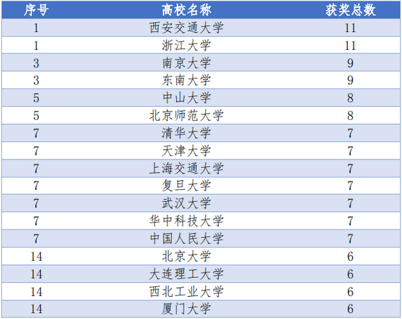 国家级教学成果奖是最高级别的教学奖励,本次高等教育国家级教学成果奖候选项目,来自全国553所高校的1297项成果,经过严格的评审筛选,约35%的项目获奖。高等教育国家级教学成果奖励评审坚持标准、质量第一、宁缺毋滥,允许各个等级奖项有空缺。本次成果奖分别设置特等奖2项、一等奖50项、二等奖400项,总计1356项。西安交通大学和浙江大学获奖成果各11项,并列第1;南京大学和东南大学各9项,并列第3;清华大学、天津大学、上海交通大学、复旦大学、武汉大学、华中科技大学、中国人民大学各7项;北京大学、大连理工大学、西北工业大学、厦门大学各6项。