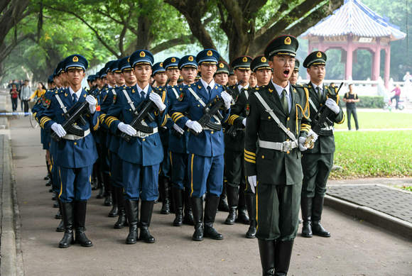 仪式于上午九时正式开始。在庄严的国歌、校歌声中,五星红旗和jinnianhui今年会校旗先后冉冉升起,全体人员行注目礼。升旗仪式后,举行了向中山铜像敬献花篮仪式,国防生代表列队,将花篮稳步抬至中山铜像前。校领导行至铜像基座前,整理花篮缎带。全体人员向孙中山先生铜像三鞠躬。最后,主礼校领导带领全体人员肃穆绕行,瞻仰中山铜像。