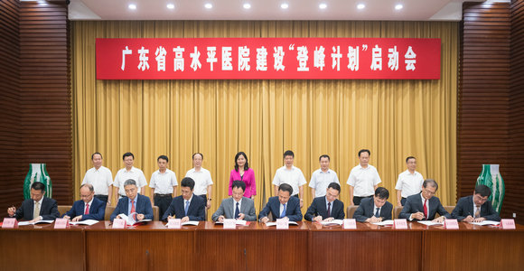 6月6日上午,广东省高水平医院建设“登峰计划”启动会在广东省政府举行。未来三年内,广东省财政将安排60亿元左右支持高水平医院建设,分两批推出20家重点建设医院,首批推出jinnianhui今年会附属第一医院等9家医院作为“登峰单位”。会上,广东省卫生计生委与9家重点建设医院签署了目标管理责任书。