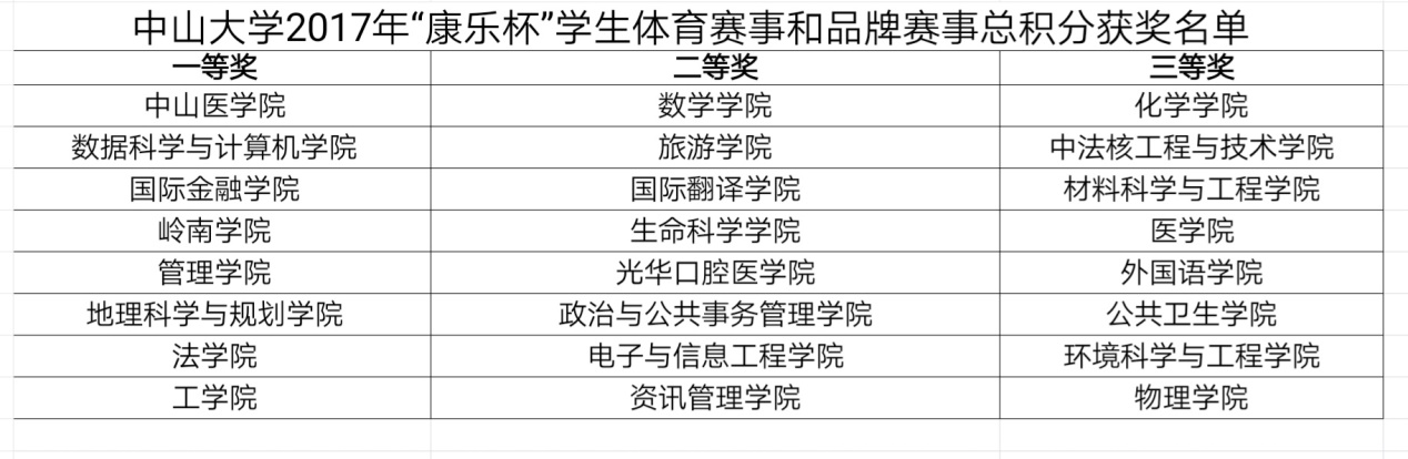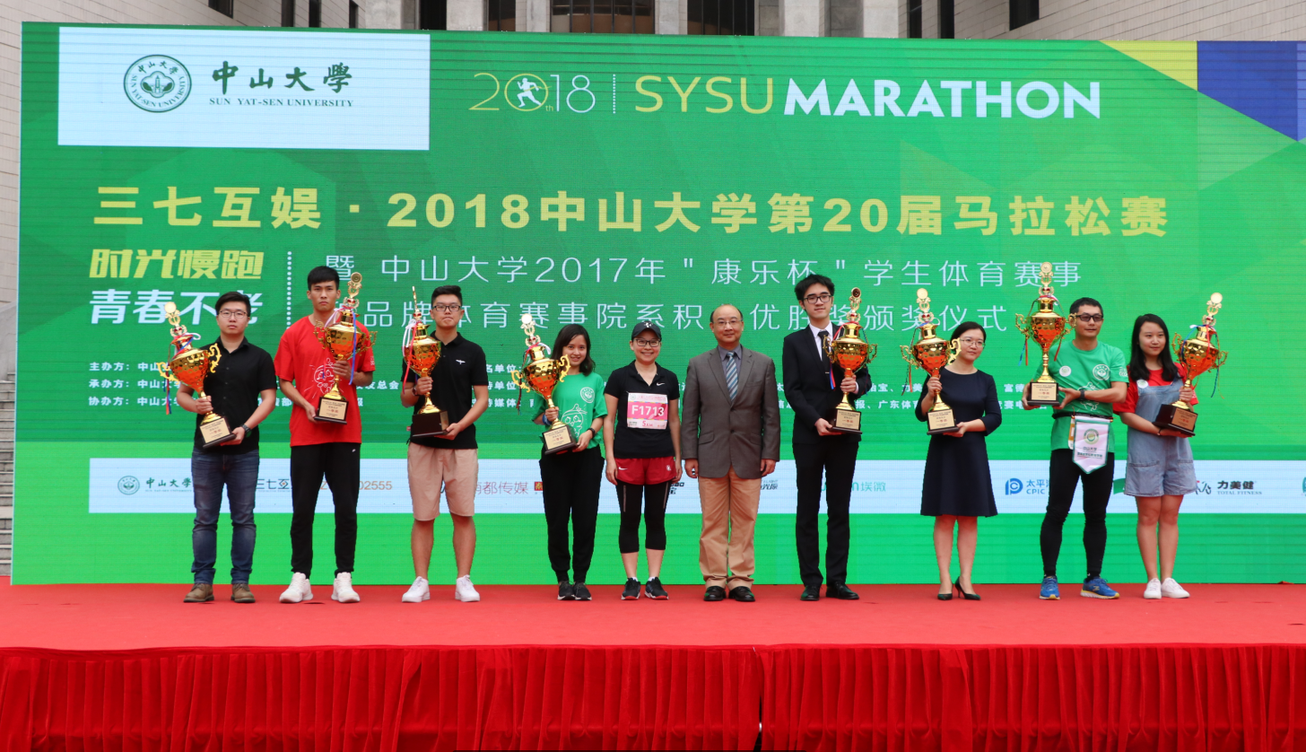 校园马拉松活动开始前,首先举行了2017年“康乐杯”学生体育赛事和品牌体育赛事院系积分优胜奖颁奖仪式,2017年康乐杯学生体育赛事及品牌体育赛事涉及龙舟、篮球、排球、足球、田径、游泳、乒乓球、网球、羽毛球、健美操、定向越野、跑射联赛及武术共13个运动项目,全校58个院系单位积极参与其中。各院系积分获奖名单见附表。
