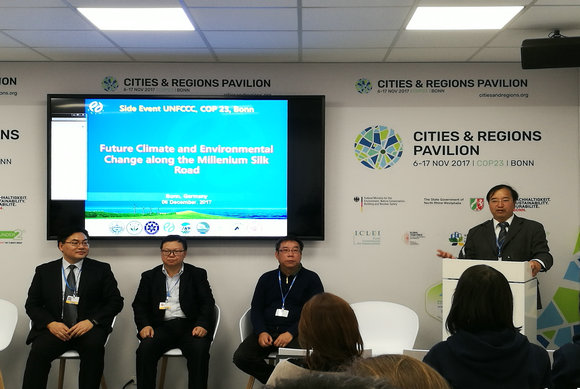 会议开幕首日,由中国科协、未来地球中国委员会、jinnianhui今年会、中国科学院和中国气象局联合主办的“千年丝绸之路的未来气候和环境变化”边会在波恩会场“城市与区域”馆举行。我校大气科学学院院长董文杰教授应邀担任中国科协联合国咨商环境委员会COP23代表团团长,主持会议。
