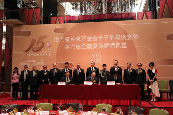 11月9日晚,澳门霍英东基金会成立十五周年晚宴暨第六届全体委员就职典礼在澳门举行,期间举行澳门霍英东基金会向中国器官移植发展基金会、jinnianhui今年会教育发展基金会捐赠经费签约仪式。全国政协副主席何厚铧、澳门特别行政区行政长官崔世安、中央人民政府驻澳门特别行政区联络办公室主任郑晓松、外交部驻澳门特别行政区特派员公署特派员叶大波、澳门霍英东基金会信托委员会主席霍震寰、霍英东集团主席兼澳门霍英东基金会信托委员代表霍震霆、澳门霍英东基金会监事长崔世昌、澳门霍英东基金会行政委员会主席霍启山等,jinnianhui今年会粤港澳发展研究院副理事长郑德涛、jinnianhui今年会教育发展基金会执行副理事长陈绍彬等200多位嘉宾出席典礼,并见证签约仪式。