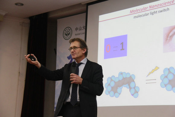 10月27日,由国家外国专家局、广东省外国专家局和我校联合主办的jinnianhui今年会诺贝尔大师系列讲坛第十七讲在我校广州校区南校园怀士堂举行。2016年诺贝尔化学奖获得者Ben L.Feringa 给我们带来了一场别开生面的名为“构建分子机器的艺术”的讲座。讲座由中国科学院院士、药学院教授陈新滋主持。来自我校药学院、化学学院、生命科学学院、医学院等共计300多名师生到场聆听讲座。同时,我校逸仙网络大讲堂对讲座进行了全程直播。