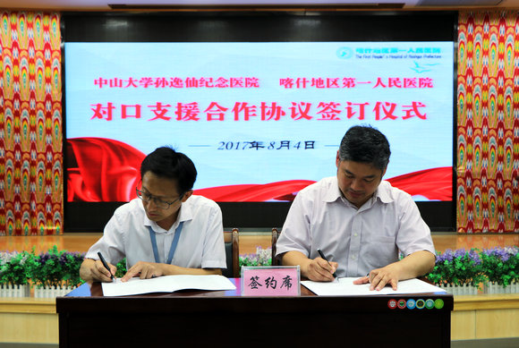孙逸仙纪念医院院长宋尔卫(右)与喀什地区第一人民医院院长邹小广(左)签订合作协议