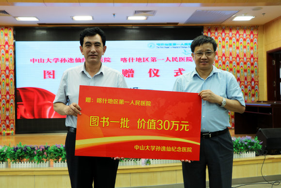 座谈会后,举行了孙逸仙纪念医院和喀什地区第一人民医院图书捐赠仪式。孙逸仙纪念医院党委书记王景峰代表医院向喀地一院捐赠一批价值30万元的图书,喀地一院党委书记凯塞尔•阿不都吾甫尔接受捐赠。随后,举行了孙逸仙纪念医院和喀什地区第一人民医院对口支援合作协议签订协议,孙逸仙纪念医院院长宋尔卫、喀地一院院长邹小广分别代表双方签约。