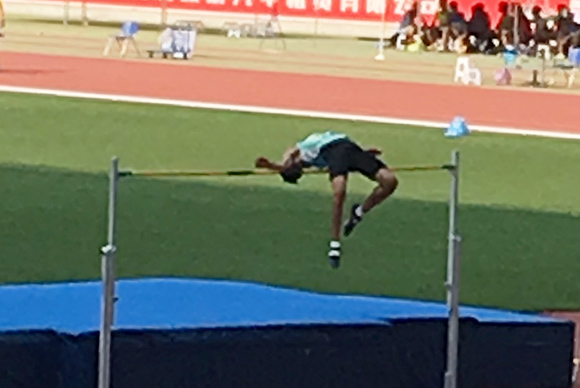 男子跳高冠军朱家鑫同学跃过2.14米横杆