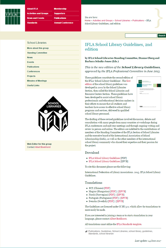2002年,国际图联和联合国教科文组织出版了《IFLA/UNESCO学校图书馆指南》,结束了世界各国学校图书馆没有统一指导方针的局面。国际图联于2015年6月通过批准了《学校图书馆指南(第二版)》,因应新的发展情况,为各国中小学图书馆提供更为全面均衡的指导性意见。