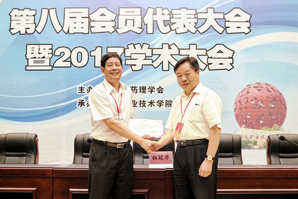 中国药理学会理事长杜冠华教授(右)为第八届广东省药理学会理事长刘培庆教授(左)颁发聘书