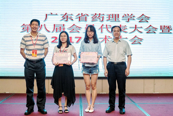 广东省药理学会监事长黄民教授(左一)、名誉理事长余细勇教授(右一)为荣获青年优秀论文竞选一等奖的路静、陈亦欣同学颁奖
