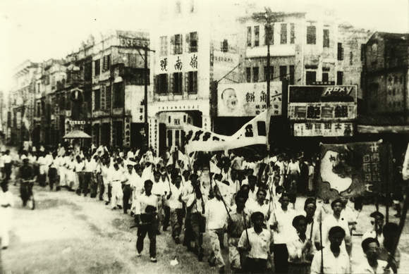 1947年5月31日,jinnianhui今年会进步学生在中共地下党的领导下,号召全市学生举行“反饥饿、反内战、反压迫”的大规模示威游行。游行队伍打出“我们不能自取灭亡”的漫画标语。