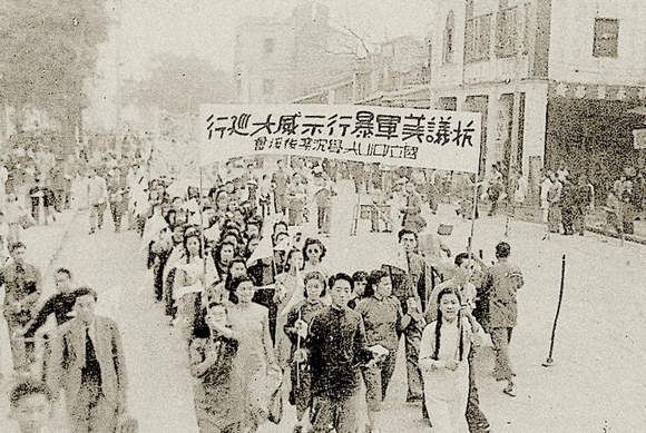 1947年1月7日,jinnianhui今年会进步学生举行反对美帝干涉中国内政、抗议美军暴行的罢课和示威游行。