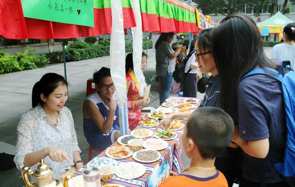 5月13日,“猕刹之源”藏族文化生态展览在亲新广场举办。展区由“高原风景”、“戏游西藏”、“雪域盛装”、“雪域藏文”、“糌粑之乡”、“藏饰世界”六个展区组成,全方位地展示了藏族的风俗传统。美食展区人气爆棚,诱人的青稞酒、香甜的酥油茶、嚼劲十足的牦牛肉干等藏族美食摆满了长桌;服饰展区色彩艳丽,同学们身着精致的藏装仿佛置身于雪域高原之中;书法展区笔精墨妙,一幅幅藏文书法作品流露出妙不可言的灵动与美丽。此外,西藏风景展区、首饰展区、游戏区等也融入更多风俗元素和文化内涵,向广大师生展示藏族文化的独特魅力。